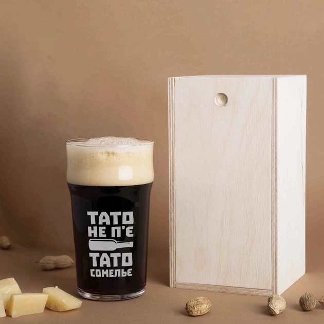 Бокал для пива "Тато не п'є. Тато сомельє" у дерев'яній подарунковій коробці 4632071