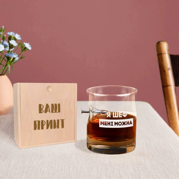 Склянка із цвяхом "Заради всього спиртного", російська, Дерев'яна подарункова коробка з гравіюванням