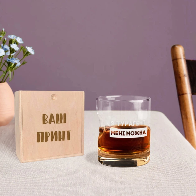 Склянка з кулею "НА ВИПАДК ВАЖЛИВИХ ПЕРЕГОВОРІВ" для віскі, російська, Дерев'яна подарункова коробка з гравіюванням