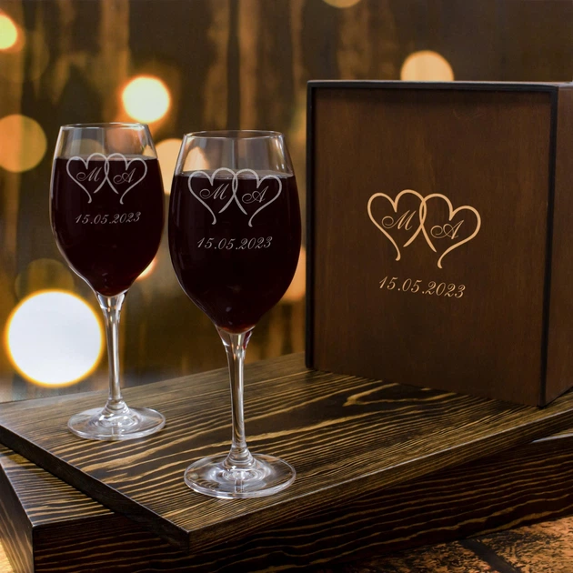 Пара винних келихів з особливим гравіюванням, 360 мл, у дерев'яній подарунковій коробці, WOODPRESENT