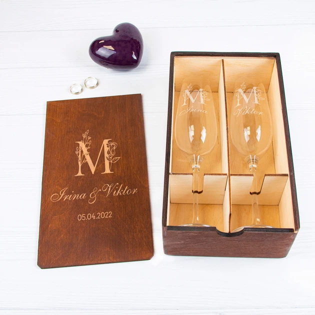 Іменні весільні келихи з гравіюванням у дерев'яній коробці, 2 шт, WOODPRESENT