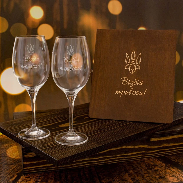 Патріотичні винні келихи з гравіюванням, 360 мл, у дерев'яній подарунковій коробці, WOODPRESENT