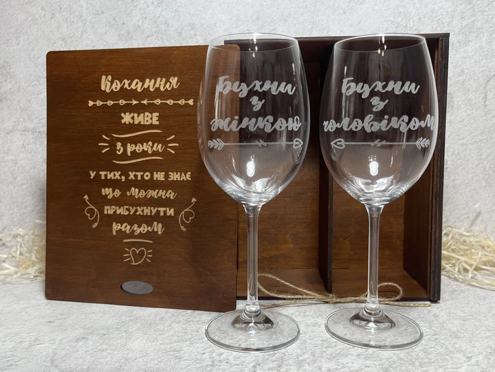 Подарунковий набір бокалів 450 мл з лазерним гравіюванням у дерев’яній коробці