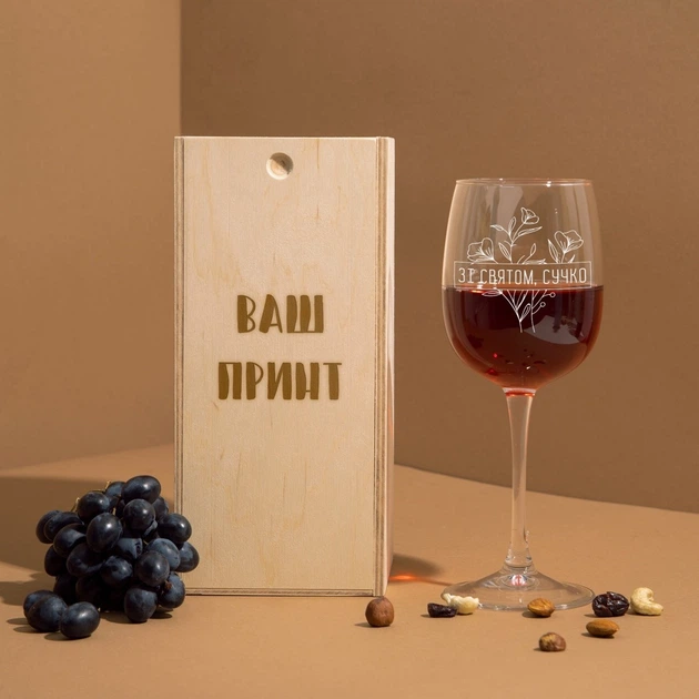 Келих для вина "Зі святом, сучко" у дерев'яній подарунковій коробці з гравіюванням 4632037