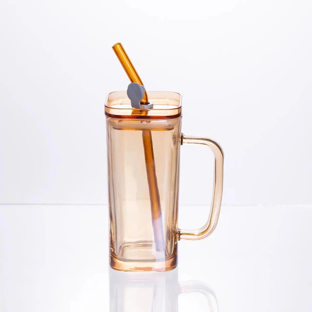 Скляна чашка з трубочкою і кришкою 280 мл стакан з трубочкою на подарунок Помаранчевий