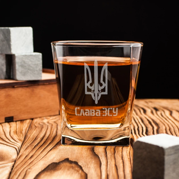 Склянка для віскі "Слава ЗСУ" у дерев'яній подарунковій коробці з гравіюванням BeriDari (BD-SV-83) 300 мл