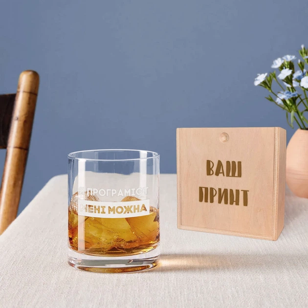 Склянка для віскі кругла "Я програміст мені можна" у дерев'яній подарунковій коробці з гравіюванням