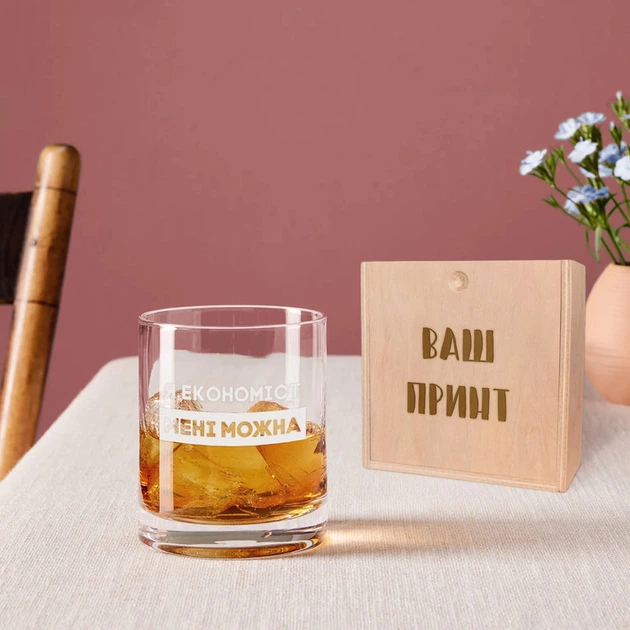 Склянка для віскі кругла "Я економіст мені можна" у дерев'яній подарунковій коробці з гравіюванням