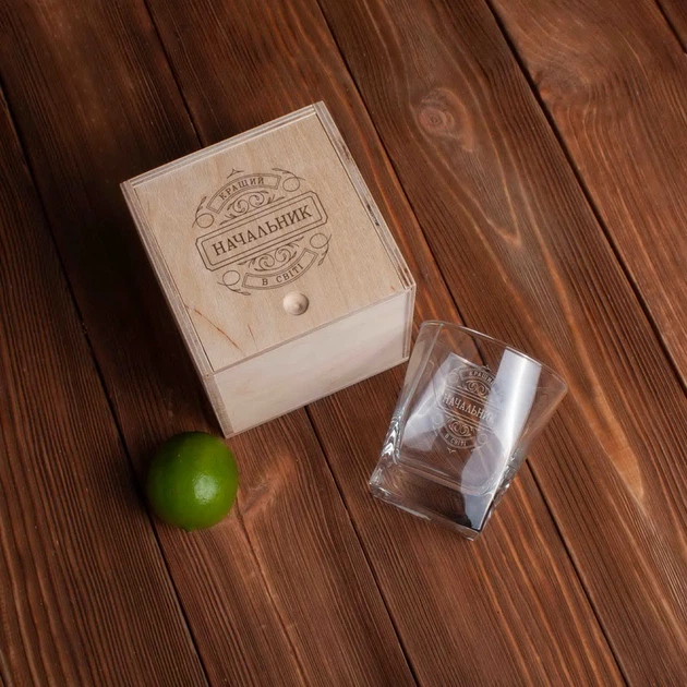 Стакан для віскі "Кращий начальник в світі", українська, Дерев'яна подарункова коробка з гравіюванням