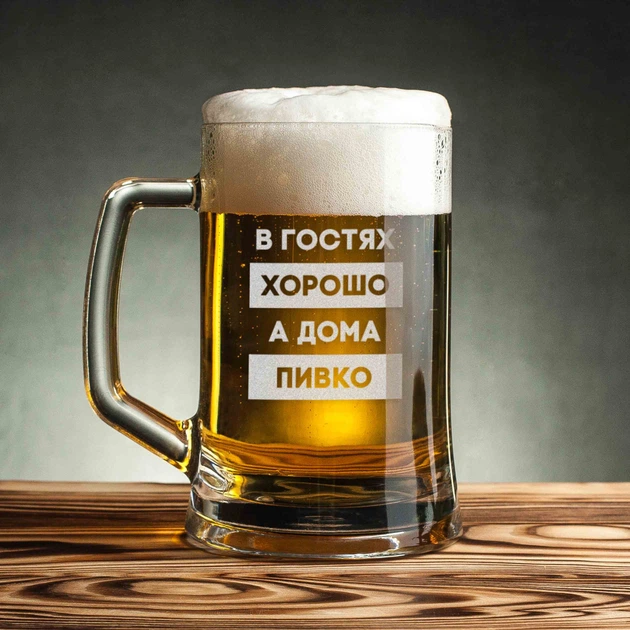 Кухоль для пива "В гостях хорошо, а дома пивко" з ручкою у дерев'яній подарунковій коробці
