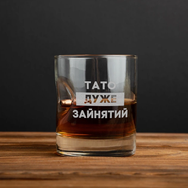 Склянка з кулею "Тато дуже зайнятий" для віскі, українська, Дерев'яна подарункова коробка 4602280