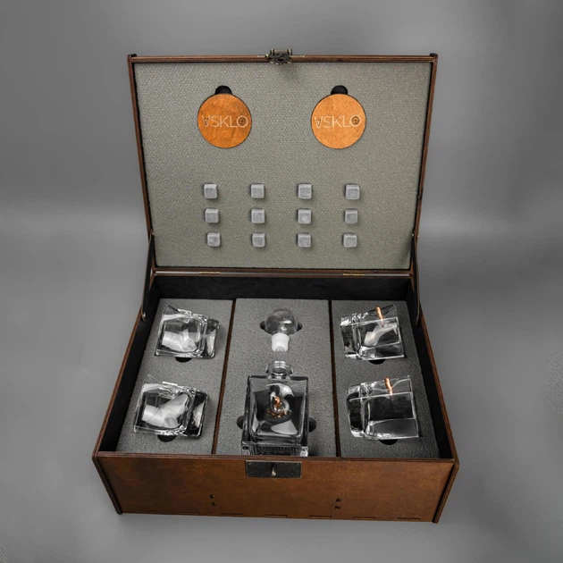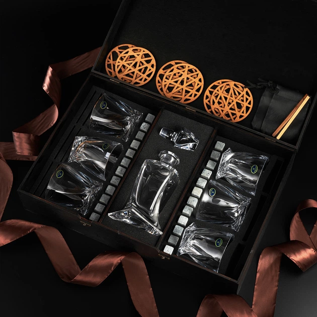 Подарунковий Набір Віскі з Камінням Для Віскі в Дерев'яному Пеналі №8 + Декантер і 4 Склянки для Віскі Bohemia Quadro + каме
