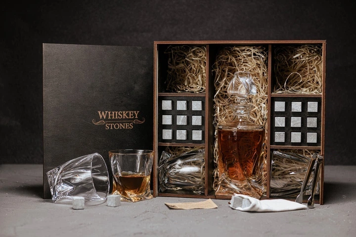Преміальний набір каміння для віскі + Склянки Sterling з кулею 4 шт. та графіном + деревяна коробка, uwest