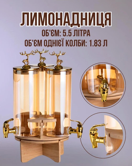 Лимонадник 3в1 Yiwu скляна лимонадниця з краником 5.5 л диспенсер для напоїв потрійний на бамбуковій підставці