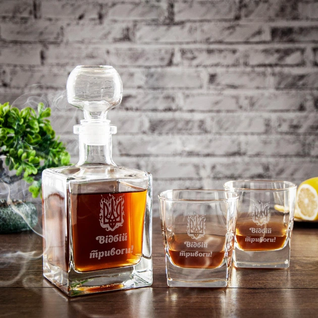 Елітний скляний набір для віскі з гравіюванням Відбій тривоги, графін + 2 склянки, картонна коробка, WOODPRESENT