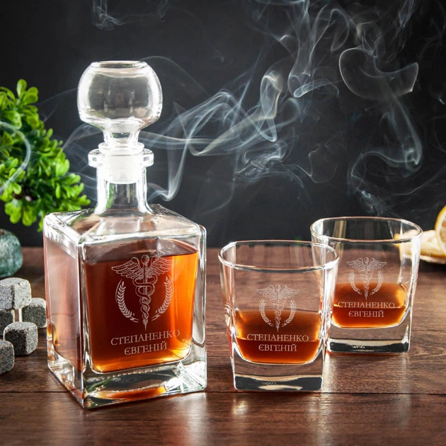 Подарунок чоловікові набір для віскі з гравіюванням, графін + 2 склянки, картонна коробка, WOODPRESENT