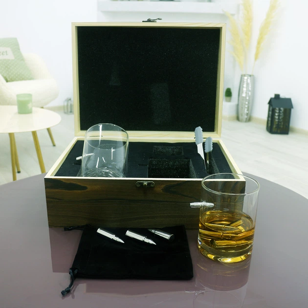 Набір "Куля" 2 склянки та 6 каменів для віскі в дерев'яній коробці - Подарунок для побратима, для друга Гранд Презент GP2412