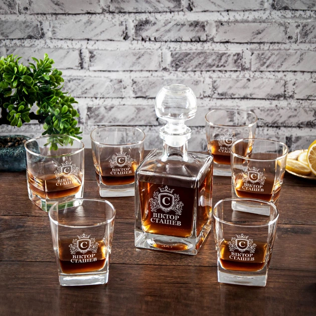 Скляний набір для віскі з іменним гравіюванням у подарунок чоловікам, графін + 6 склянок у дерев'яній коробці, WOODPRESENT