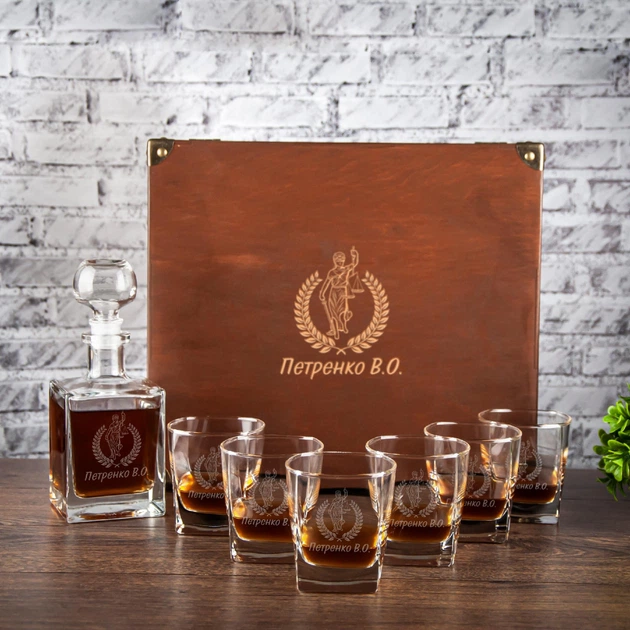 Подарунковий набір для виски юристу з гравіюванням, графін + 6 склянок у дерев'яній скрині, WOODPRESENT