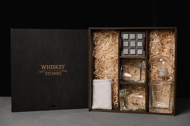 Подарунковий набір для віскі з іменним гравіюванням на замовлення в дерев'яній коробці, графін + 2 склянки, WOODPRESENT