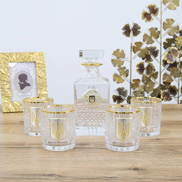 Набір для віскі графін і 4 склянки кришталь, срібло 925, золото, захисний лак Prezent Герб 310 мл