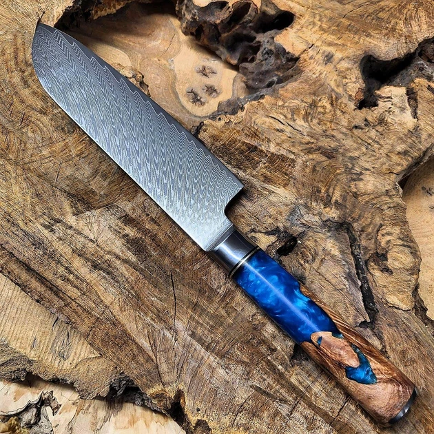 Японський шеф-ніж Сантоку 18 см із 67-шарової дамаської сталі з серцевиною VG10 та руків’ям із капу сандалового дерева.