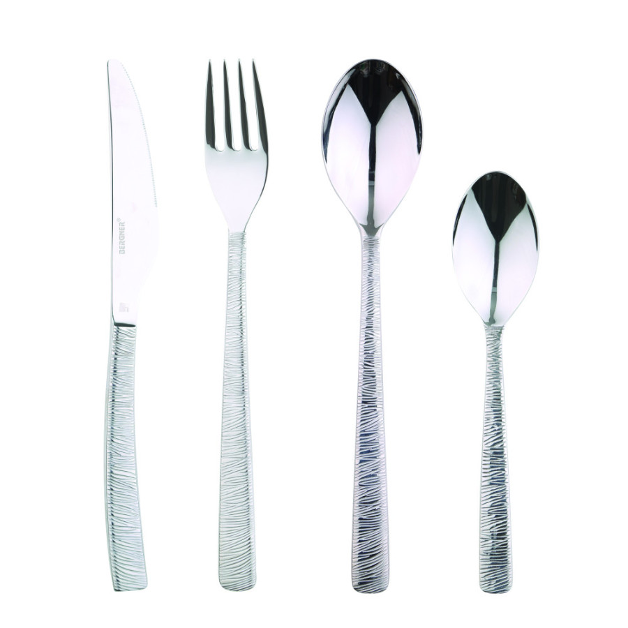Столові прибори Muza Gold виготовлені з нержавіючої сталі 18/10, що відрізняється особливою міцністю. Виконані в глянцевому кольорі відтінку шампань, вони чудово впишуться у багато інтер'єрів. Їхній унікальний колір робить їх ідеальними для особливих випадків, таких як сімейні урочистості, свята або весілля, але не тільки їх універсальна форма також робить їх придатними для повсякденного використання.Столові прибори можна мити в посудомийній машині. Проте намагайтеся використовувати м'які миючі засоби та режими для посудомийної машини!Комплект міститьСтоловий ніж: 6 шт.Столова ложка: 6 шт.Столова вилка: 6 шт.Ложка для кави та чаю: 6 шт.