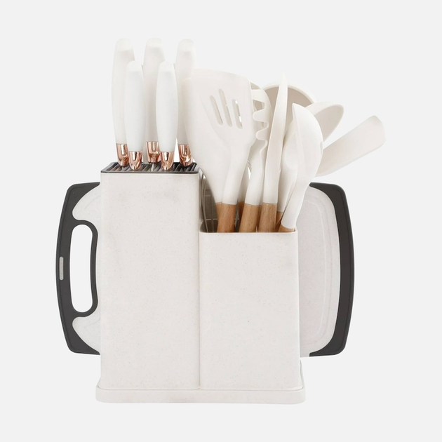 Набір кухонного приладдя на 19 предметів: силіконові прибори + набір ножів на підставці + дошка для нарізання White