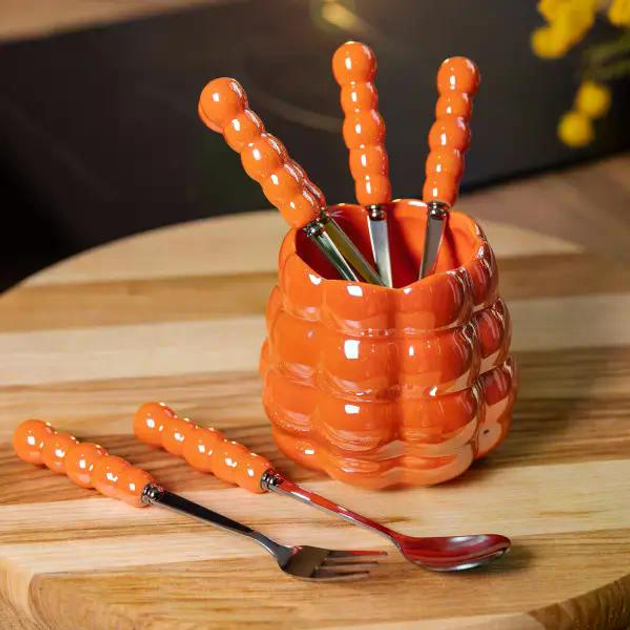 Набір десертних вилок та ложок помаранчевий у керамічній підставкі на 3 персони з високоякісної нержавіючої сталі