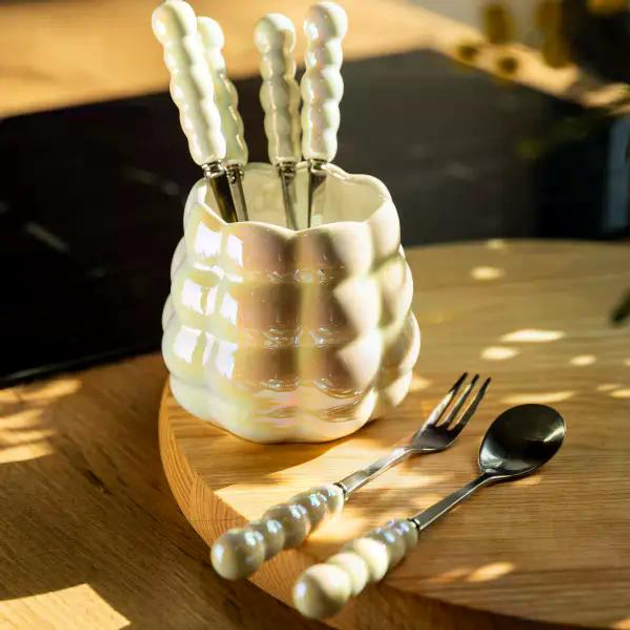 Набір десертних вилок та ложок перламутровий у керамічній підставкі на 3 персони з високоякісної нержавіючої сталі