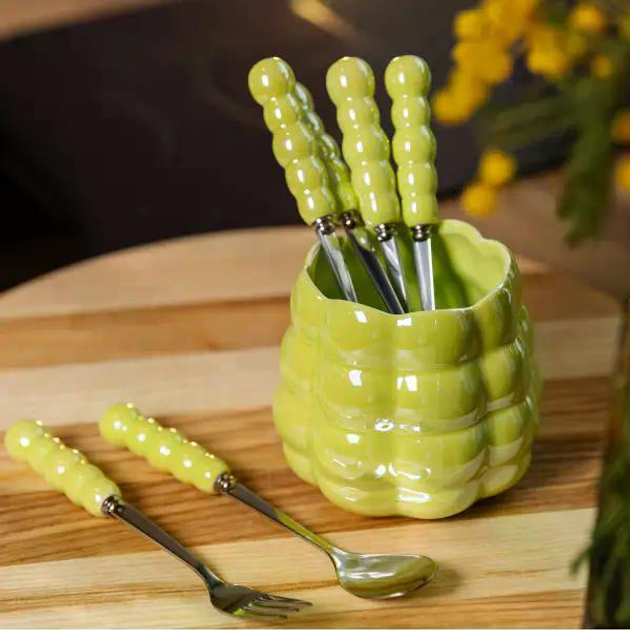 Набір десертних вилок та ложок зелений у керамічній підставкі на 3 персони з високоякісної нержавіючої сталі