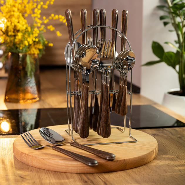 Сріблястий набір столових приладів на підставці 24 предмети з дерев'яними ручками