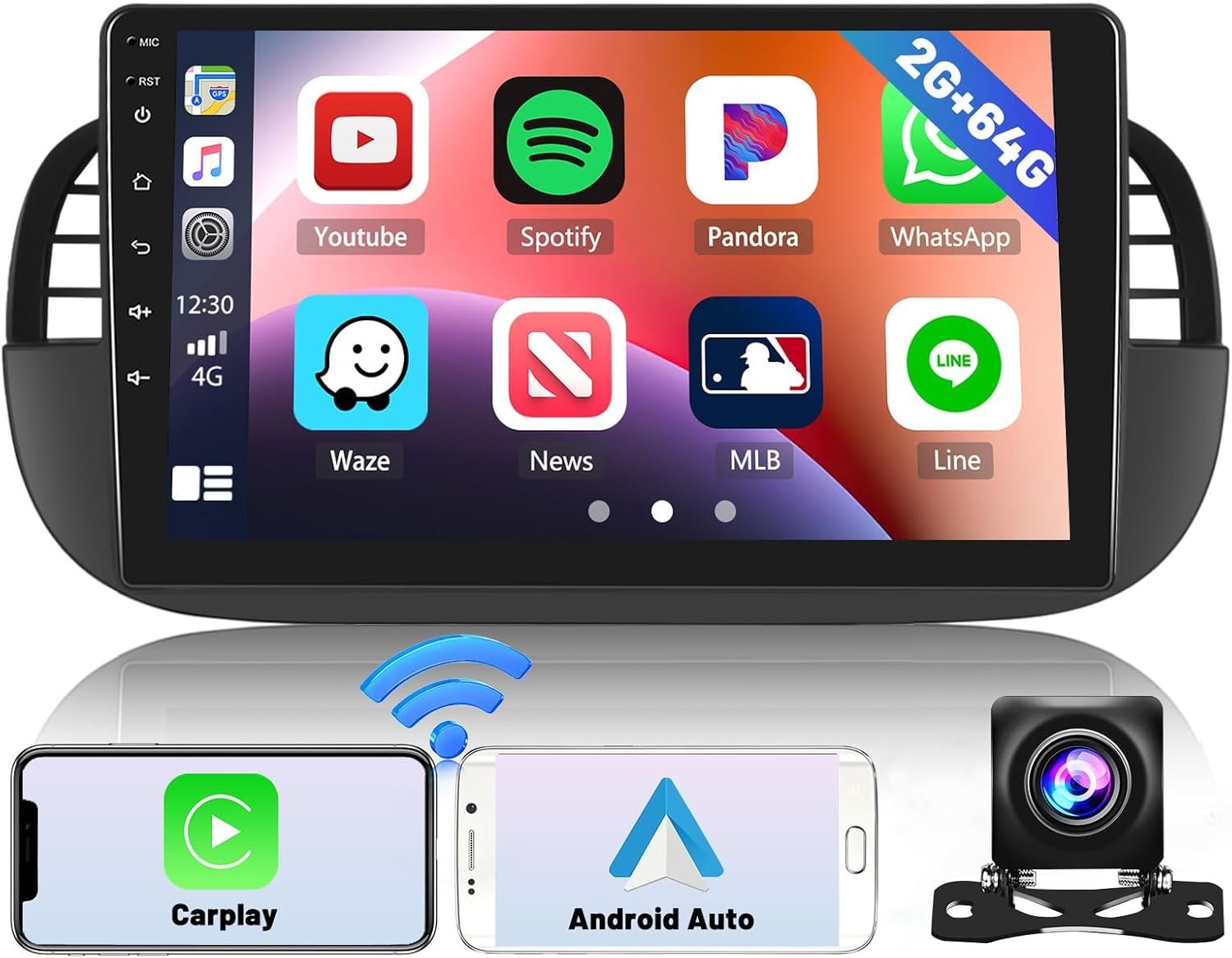 Штатна автомагнітола Hikity для FIAT 500 2007-2015 / 9" / Сенсорна / 2/64Гб / Android 13 / Apple CarPlay / Android Auto / Bl