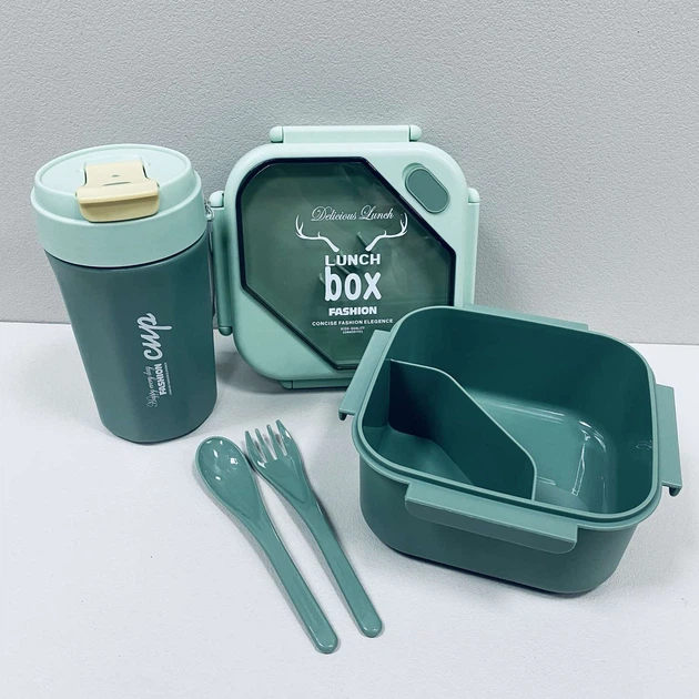 Ланч бокс пластиковий 2 відділення з пластиковою пляшкою A-PLus 3748 зелений