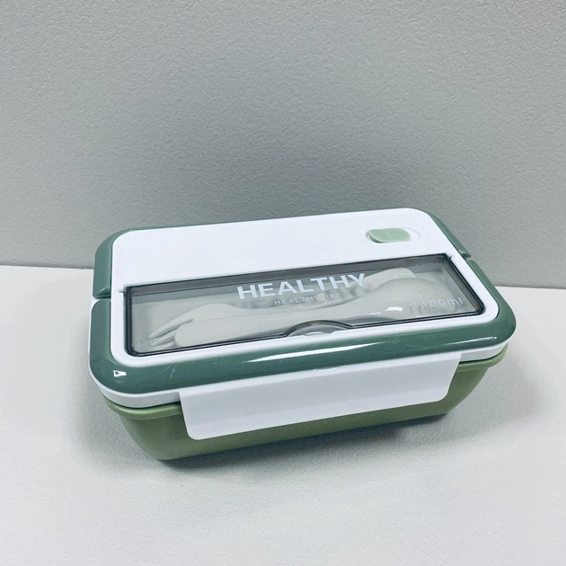 Ланч бокс пластиковий зі столовими приборами з двома відділами A-Plus 3036 зелений з білим