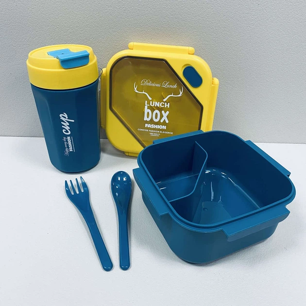 Ланч бокс пластиковий 2 відділення з пластиковою пляшкою A-PLus 3748 синій з жовтим