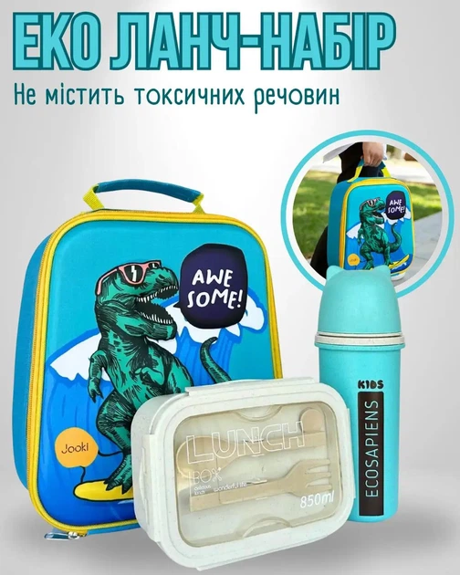 Еко ланч-набір 4в1 3D термосумка Dinosour термобутилка 500 мл ланчбокс 850 мл набір для школи та офісу