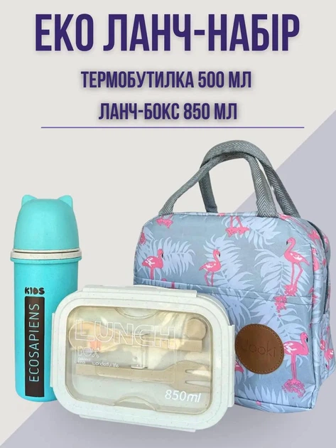 Еко ланч-набір 4в1 3D термосумка Flamingo термобутилка 500 мл ланчбокс 850 мл набір для школи та офісу
