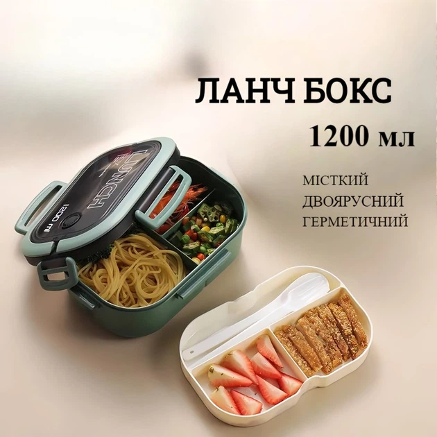 Ланч бокс для їжі 1200 мл з приборами, контейнер для їжі з на 2 секції з пластику 21х13,5х7 см Зелений
