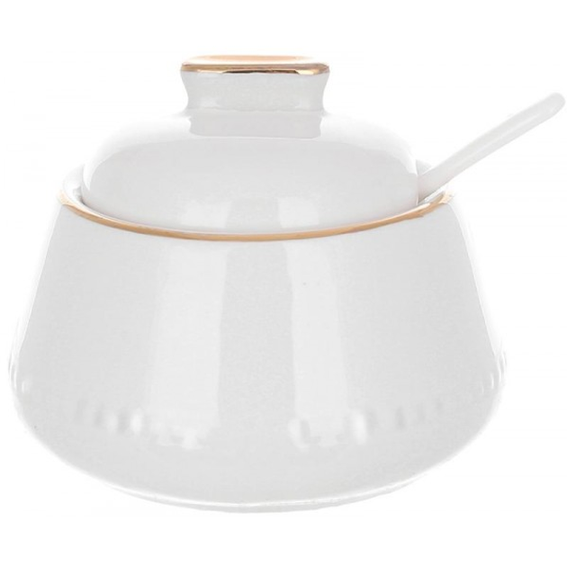 Цукорниця "Valencia" 300мл, біла фарфорова із золотою облямівкою та фарфоровою ложечкою (111608)