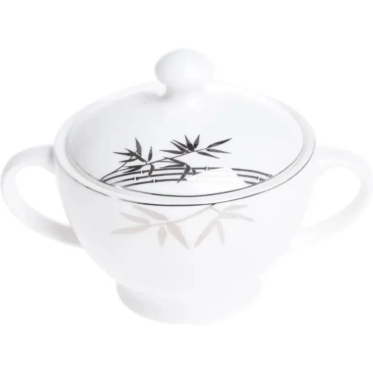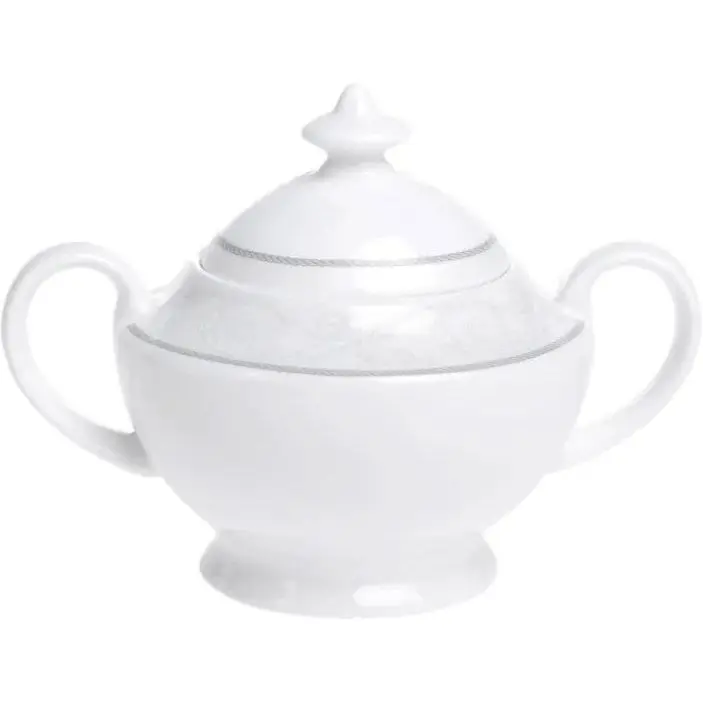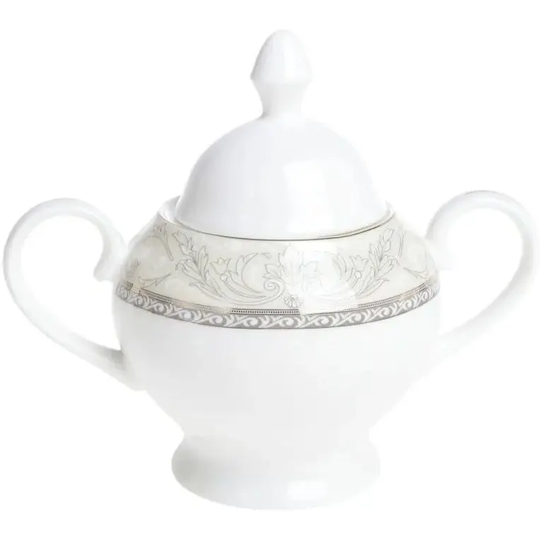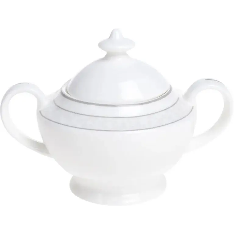 Цукорниця виготовлена з кістяної порцеляни, який відрізняється особливою вишуканістю. Вироби з нього настільки тонкі, що можна побачити, як вони просвічуються. Цукорниця декорована облямівкою сріблястого кольору і красивим ненав'язливим візерунком. Вона прикрасить кожен стіл і стане чудовим подарунком для ваших близьких. Ви можете купити цукорницю окремо або в комплекті з