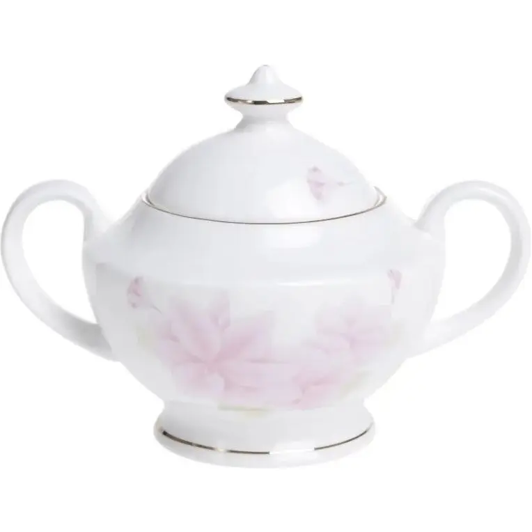 Цукорниця виготовлена з кістяної порцеляни, який відрізняється особливою вишуканістю. Вироби з неї настільки тонкі, що можна побачити, як вони просвічуються. Цукорниця декорована золотистою облямівкою і квітковим візерунком ніжного рожевого кольору. Вона прикрасить кожен стіл і стане чудовим подарунком для ваших близьких. Ви можете купити цукорницю окремо або в комплекті з
