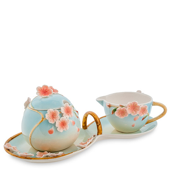 Набір чайний фарфоровий 3 предмети цукорниця, молочник та підставка Сакура 6001037