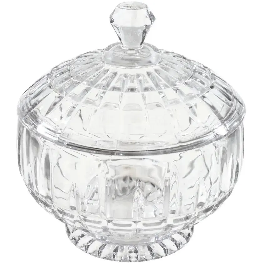 Цукорниця Тефіда NGD184SUG місткий та вишуканий посуд, який стане прикрасою святкового столу. Вона виготовлена з якісного богемського скла, міцна та прозора, має круглу форму. Рельєфний малюнок, на якому чітко виділяються контури листочків, робить цукорницю дуже милою та домашньою. Висота виробу 18 см, діаметр 15, 5 см. Цукорниця закривається масивною кришкою, що має зручну ручку.
