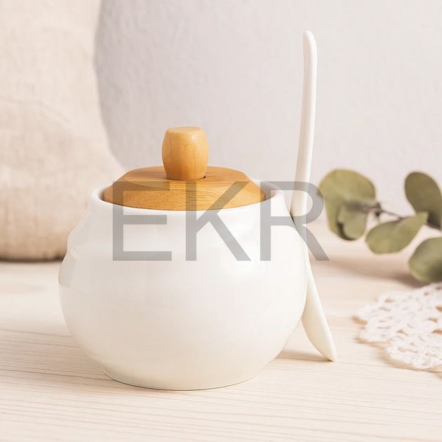 Цукорниця порцелянова 300 мл з бамбуковою кришкою та ложкою (938-039)