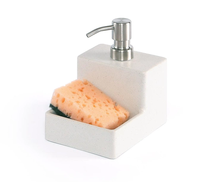 Дозатор засобу для миття посуду настільний із каменю білого кольору з підставкою держателем для губки, диспенсер настільний