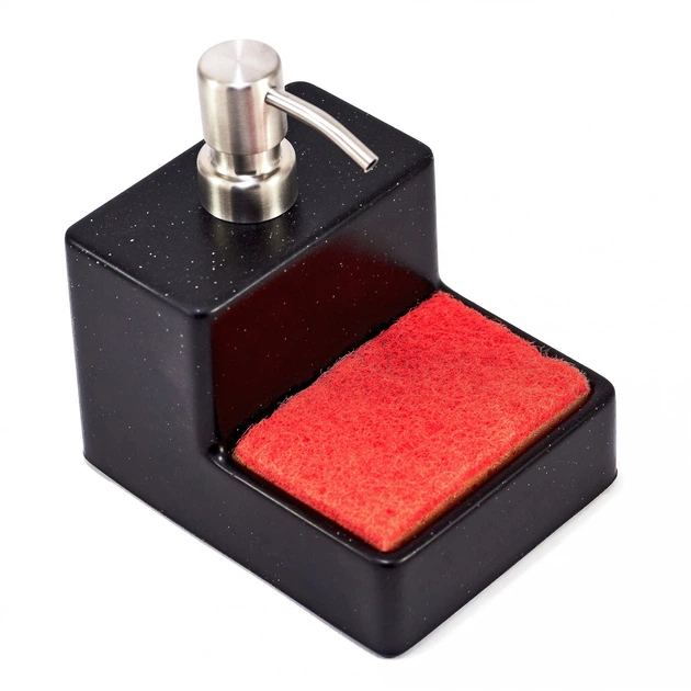 Дозатор засобу для миття посуду настільний із каменю чорного кольору з підставкою держателем для губки, диспенсер настільний