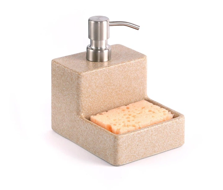 Дозатор засобу для миття посуду настільний із каменю бежевого кольору з підставкою держателем для губки, диспенсер настільни