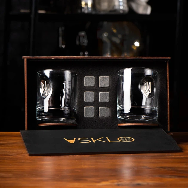 Каміння для віскі, склянки 2шт. з гербом + деревяна коробка, uwest