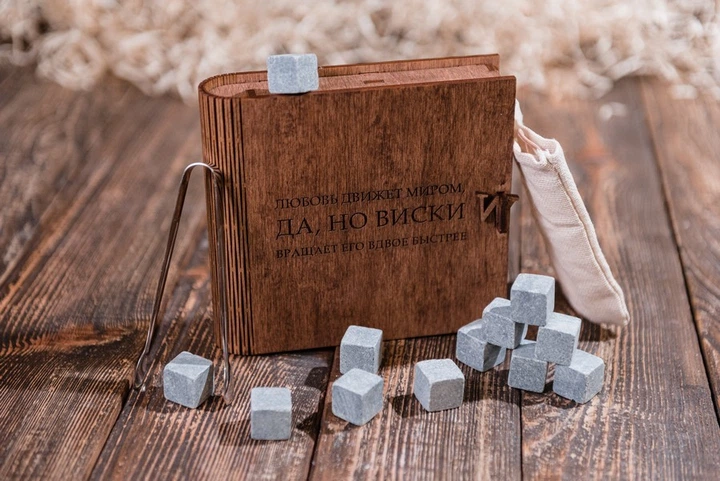 Подарочный набор камней для виски в шкатулке книге "Виски вращает мир"